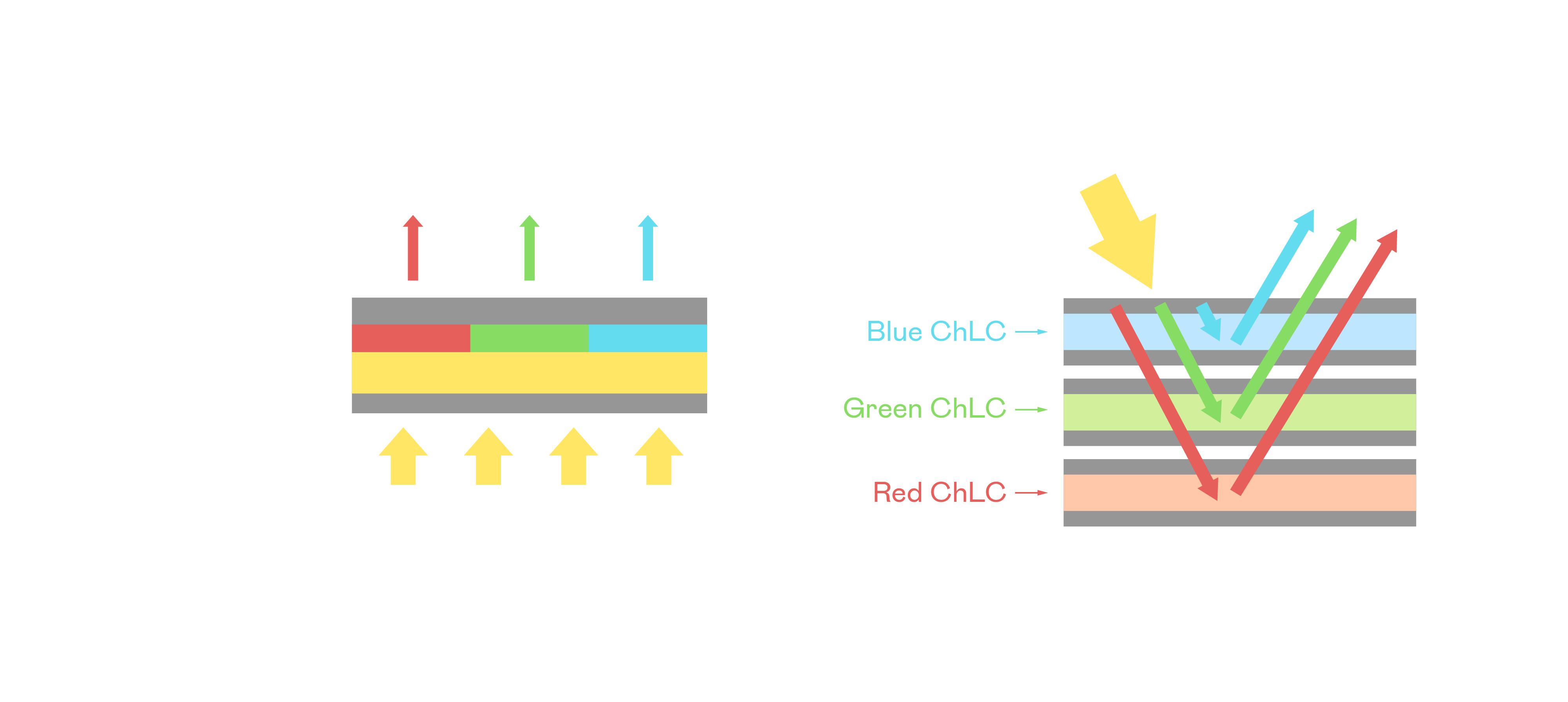天九娱乐胆固醇液晶显示器是由红、绿、蓝三层胆固醇液晶面板堆叠而成,并采用无彩色滤光片设计,减少环境光在反射过程中的损耗。